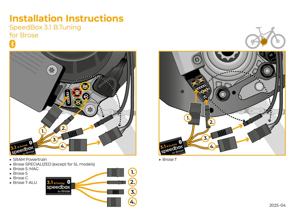 Novinka SpeedBox 3.1 B.Tuning pre Brose prináša jedinečné spojenie elektrického bicykla s mobilným telefónom. Produkt je do posledného detailu optimalizovaný pre výkon a maximálny zážitok z jazdy. Zariadenie deaktivuje rýchlostný limit elektrického bicykla a vy si môžete vychutnať jazdu bez obmedzenia rýchlosti. Vďaka mobilnej aplikácii SpeedBox App môžete sledovať a zaznamenávať všetky parametre jazdy na displeji svojho telefónu. Kedykoľvek a kdekoľvek.
